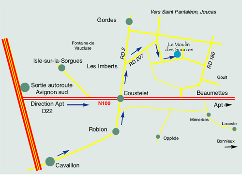 Quand vous arrivez de l’autoroute A7 en venant de Lyon, sortir à Avignon sud, prendre direction Apt par la D22 puis la N100, jusqu’à Coustelet. Au feu à Coustelet tourner à gauche en direction de Gordes/Les Imberts. A la sortie des Imberts prendre à droite direction les Gros/Temple, continuer sur 1 Km et tourner à droite direction les Gros/Temple sur 1 Km. Vous arrivez face à un mur, tournez 2 fois à gauche et vous trouverez le moulin sur votre gauche, continuez 50 mètres, tournez a gauche pour atteindre le parking.